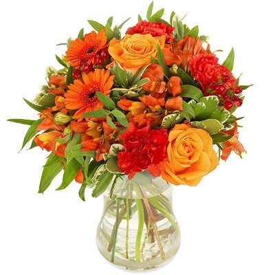 Efterårsbuket med blomster såsom roser, alstromeria, nelliker og hypericum sammen med sæsonens grønt. Med sine orange og klarrøde farver bliver denne buket en uforglemmelig overraskelse. Buketten er et eksklusivt floristhåndværk, og blomsterne er nøje udvalgt for at sikre høj kvalitet. Hver buket er unik og bindes ud fra sortiment og sæson – men bevarer altid sin farve og form. Buketten leveres af en lokal florist.